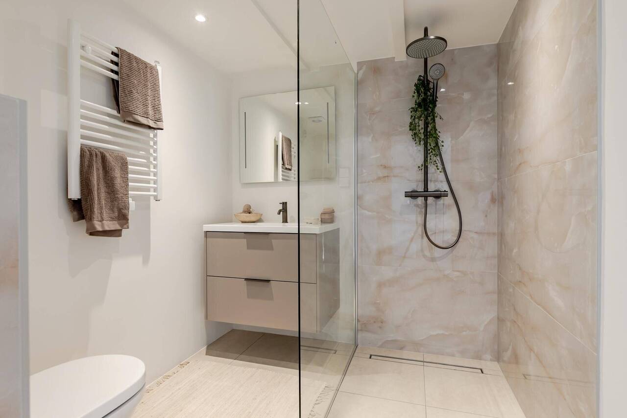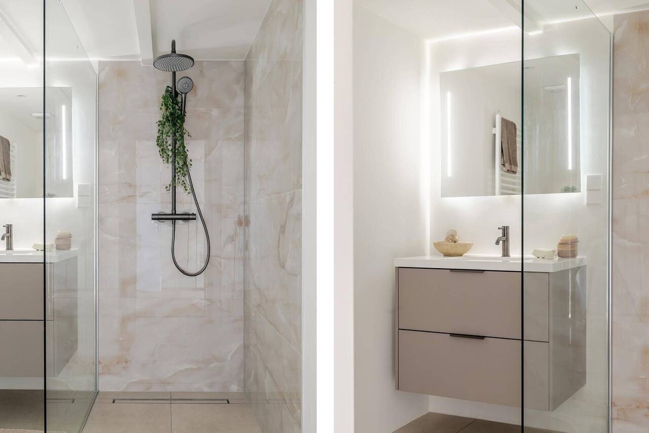 De badkamer is voorzien van een ruime inloopdouche met glazen wand, ééngreeps mengkraan, vloerverwarming en handdoekradiator en wastafelmeubel met spiegel met verlichting.