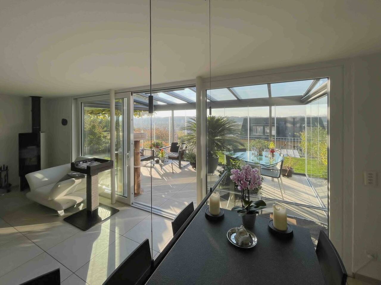 Herzstück des Hauses ist das grosszügige, lichtdurchflutete Wohn- und Esszimmer mit Schwedenofen, das zu gemütlichen Stunden mit Familie und Freunden einlädt. Die grossen Fenster – ausgestattet mit Mückenschutzgittern – lassen viel Tageslicht herein und eröffnen den Blick in die Umgebung. Der vorgelagerte, unbeheizte Wintergarten erweitert den Wohnraum auf elegante Weise und kann in den Sommermonaten vollständig geöffnet werden, sodass Innen- und Aussenbereich harmonisch miteinander verschmelzen.