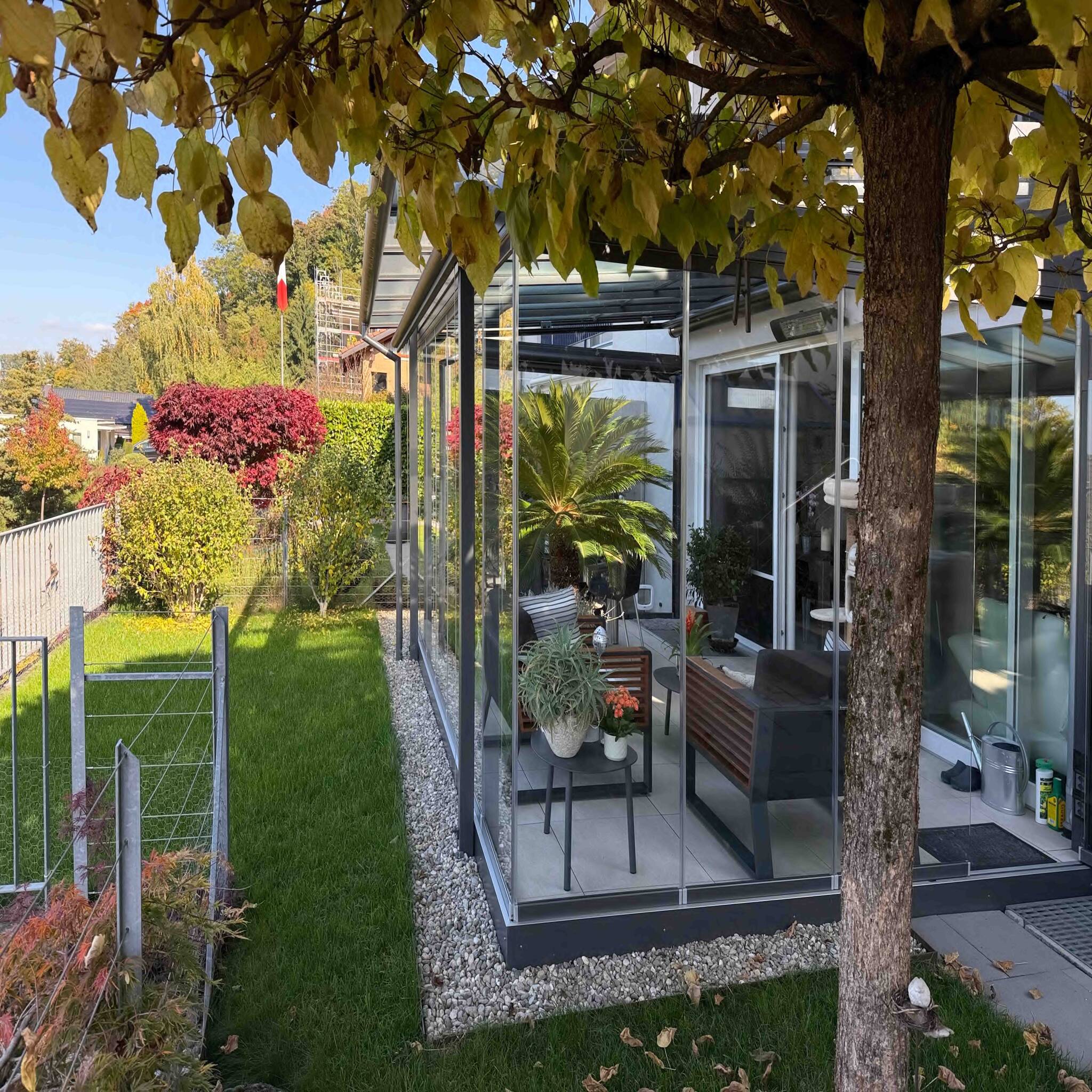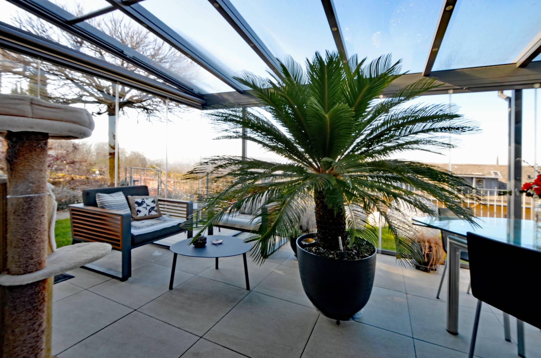 Balkon, Wintergarten und Sitzplatz im Garten eröffnen vielfältige Möglichkeiten, den Aussenraum je nach Wetter und Tageszeit zu geniessen.