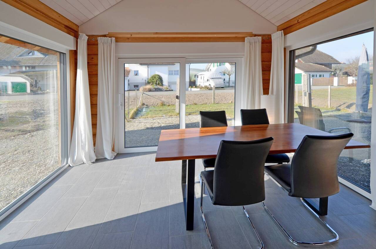 Die offene, lichtdurchflutete Architektur schafft ein einladendes Ambiente. Der grosszügige Wohn- und Essbereich lädt zum Verweilen ein, während die moderne Küche mit hochwertigen Geräten und separatem Vorratsraum keine Wünsche offenlässt. Der elegante, graue Steinboden bildet einen stilvollen Kontrast zur warmen Holzstruktur des Hauses, und der Schwedenofen im Wohnzimmer sorgt für wohlige Behaglichkeit.