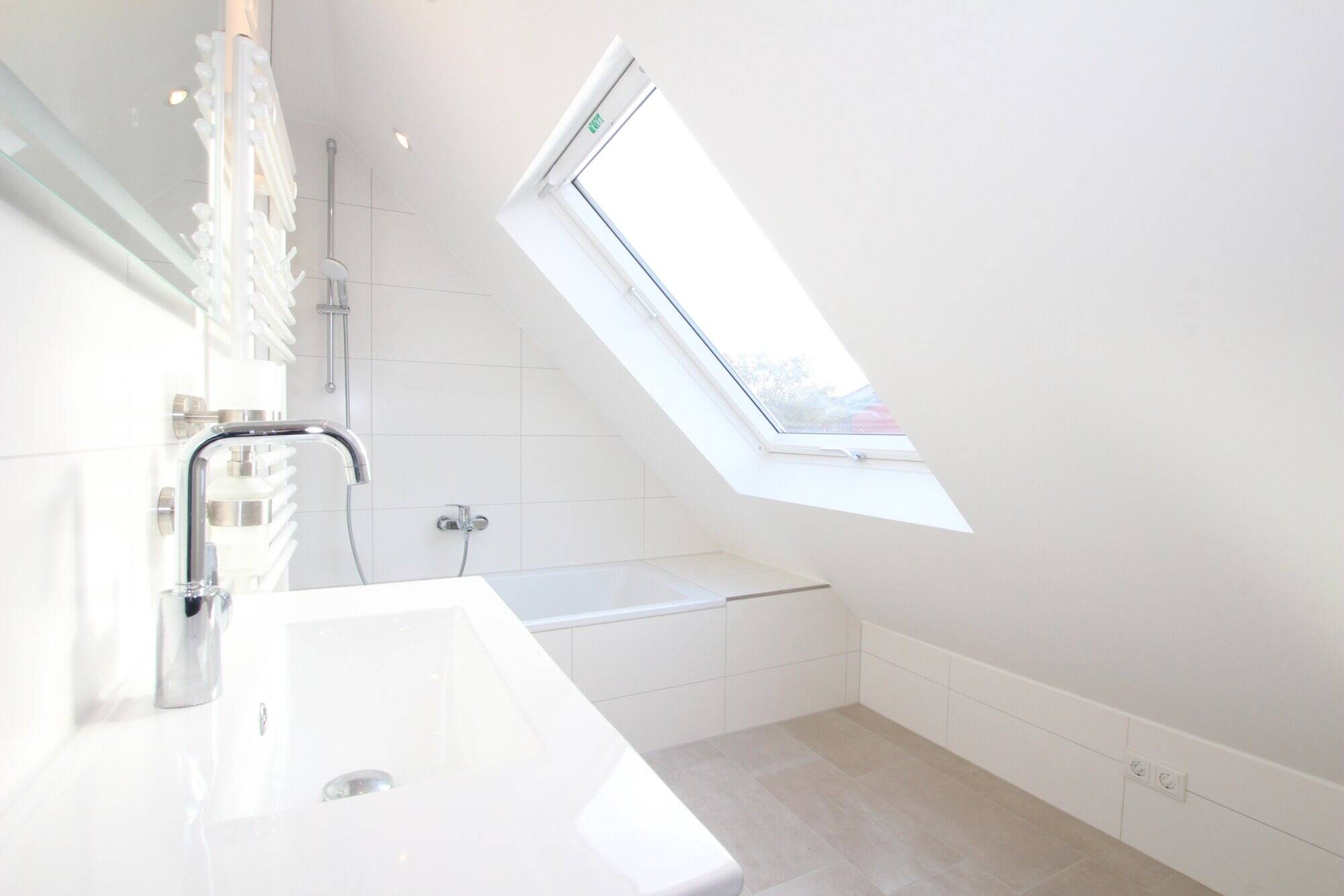 Das lichtdurchflutete ebenfalls ca. 2017 sanierte Badezimmer wurde modern ausgestattet und verfügt über eine Badewanne mit Glasduschabtrennung, ein Hänge-WC, einen Waschtisch sowie eine Handtuchhalterheizung.