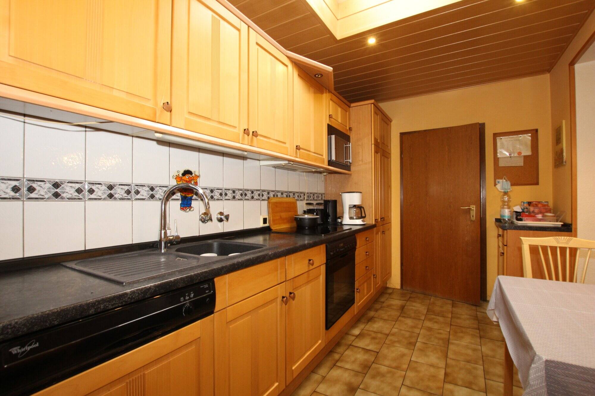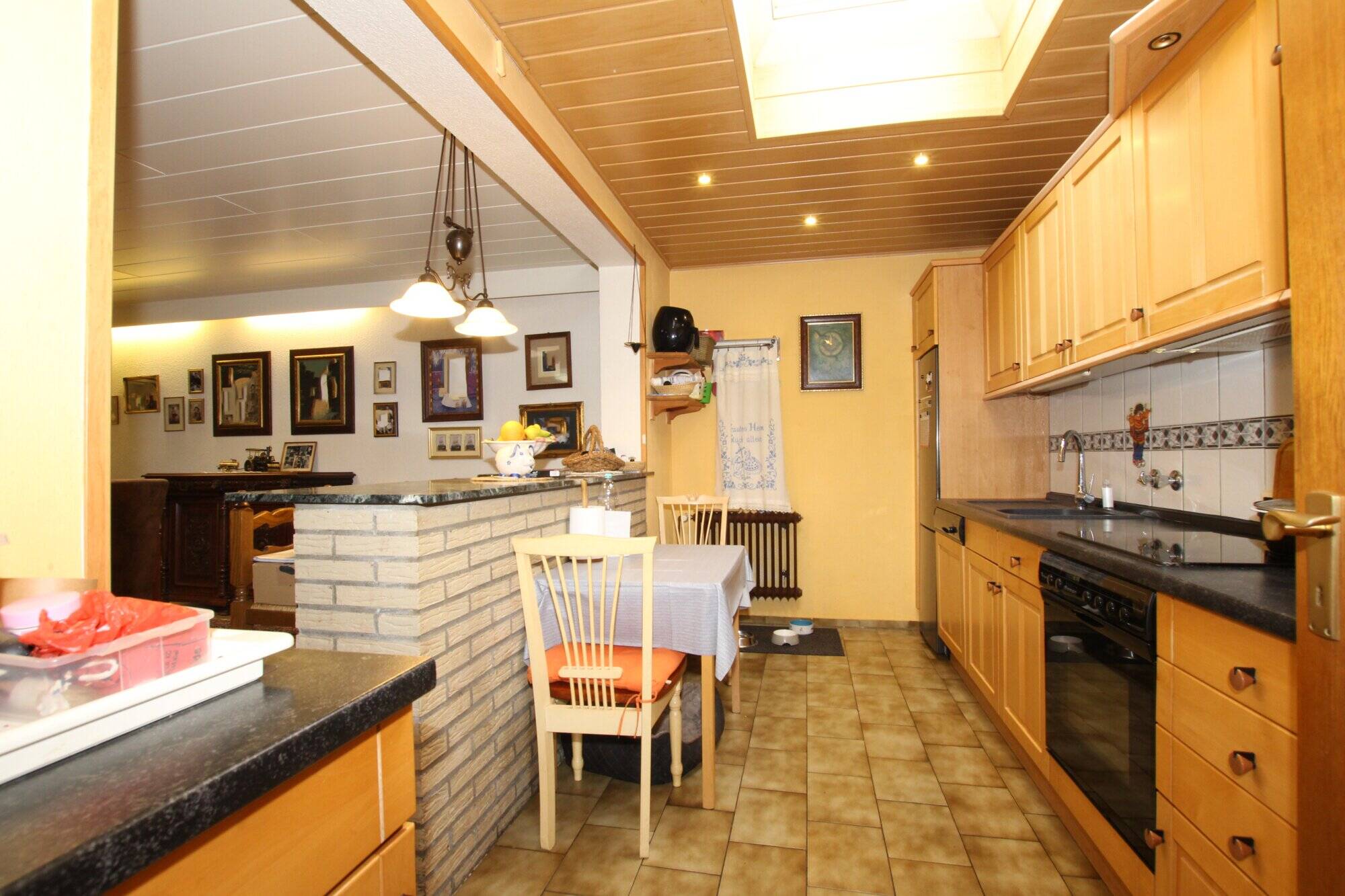 Die Küche grenzt harmonisch an den Wohnbereich an und fügt sich in das offene Wohnkonzept ein. Nach Rücksprache mit den Eigentümern kann sie gerne im Haus verbleiben. Alternativ bietet sie ausreichend Raum, um sie nach eigenen Vorstellungen zu gestalten. Besonders praktisch ist der integrierte Wäscheabwurf ins den Keller, der den Alltag deutlich erleichtert.