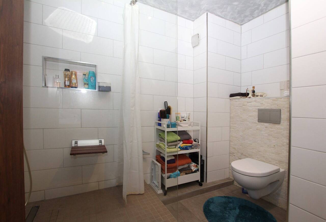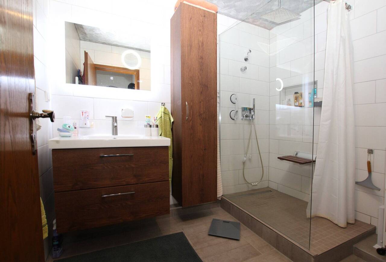 Das ebenfalls ca. 2021 modernisierte und gut geschnittene Badezimmer ist ausgestattet mit einer Walk-In Dusche, einem Hänge-WC, einem Waschtisch und verfügt auch über einen elektronischen Abzug.