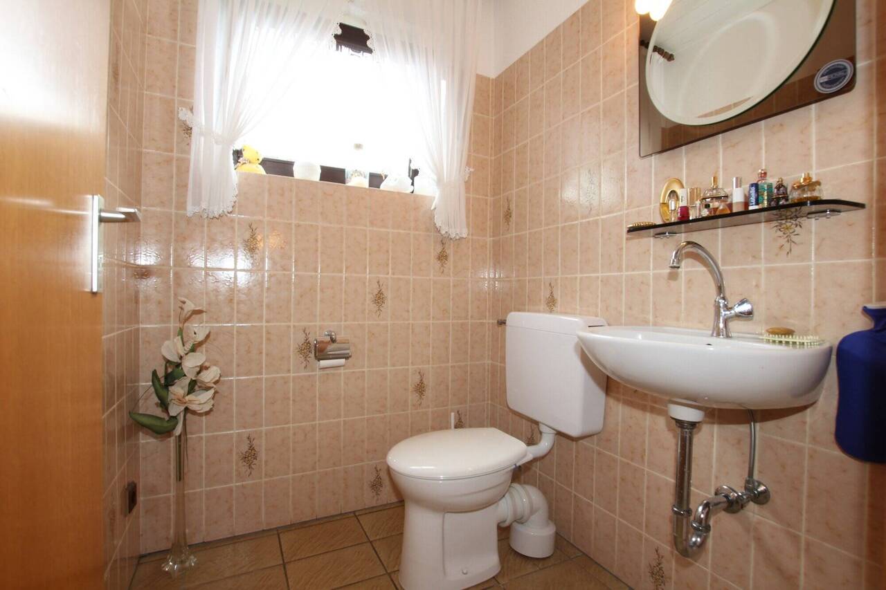 Das separate Gäste-WC befindet sich ebenfalls im Erdgeschoss. Es ist noch im Stil des Baujahres gehalten und verfügt über ein klassisches Stand-WC sowie ein Fenster für natürliche Belüftung.